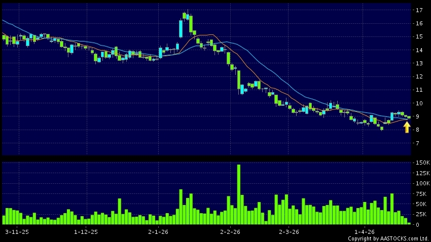 金蝶国际(00268.HK) -0.270 (-3.176%) 沽空 $4.47千万; 比率 16.936% 10天移动平均线升穿20天移动平均线,出现黄金交叉。现价报8.950,下跌0.445%,成交量5.66百万股,成交额5.02千万。