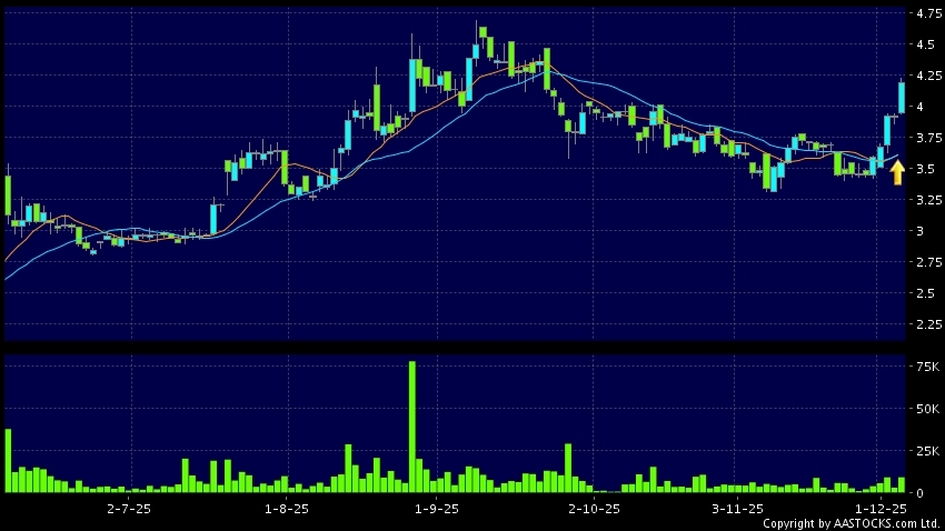华宝国际(00336.HK) -0.060 (-1.453%) 沽空 $3.31百万; 比率 11.140% 10天移动平均线升穿20天移动平均线,出现黄金交叉。现价报4.210,上升7.673%,成交量9.78百万股,成交额4.05千万。