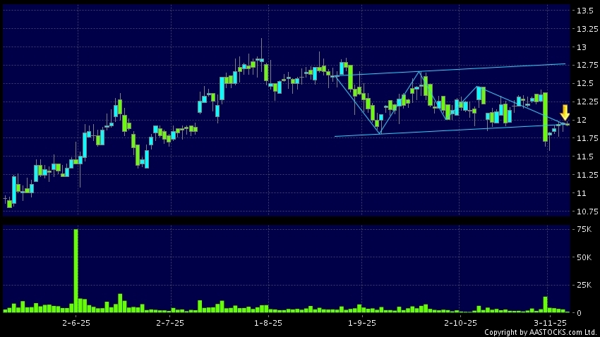 区域突破指股价在过去的一段时间只在一个范围在内活动,然後股价下跌作出突破,跌穿区域的底部,技术走势偏软。(港股报价延迟最少十五分钟。沽空资料截至 2025-11-11 16:25。)