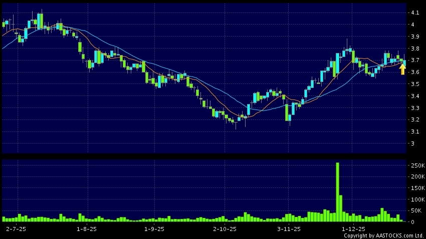 中国光大银行(06818.HK) -0.040 (-1.075%) 沽空 $4.20百万; 比率 28.867% 10天移动平均线升穿20天移动平均线,出现黄金交叉。现价报3.700,上升0.271%,成交量2.27百万股,成交额8.41百万。