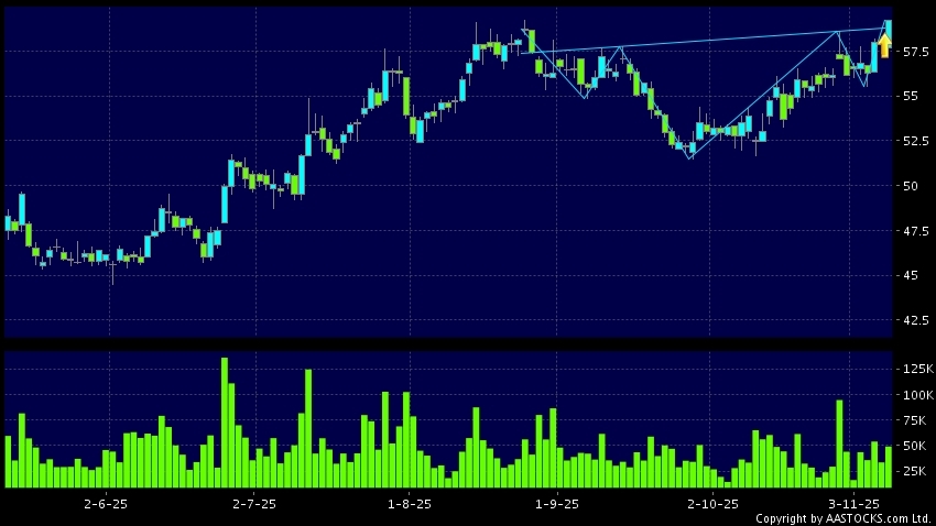 中國平安(02318.HK) +0.200 (+0.338%) 沽空 $5.22億; 比率 27.655% 呈現頭肩底向上突破,股價升穿頸線。現價報59.200,上升2.157%,成交量4.91千萬股,成交額28.90億。